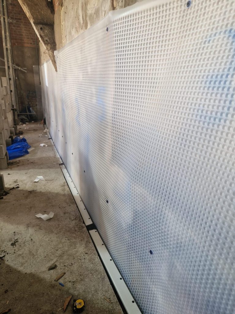 The photo shows the ongoing installation of a Type C drained protection system on the internal surface of the walls. In this system any water ingress as a result of the raised external ground levels is managed away via the cavity drain membrane.