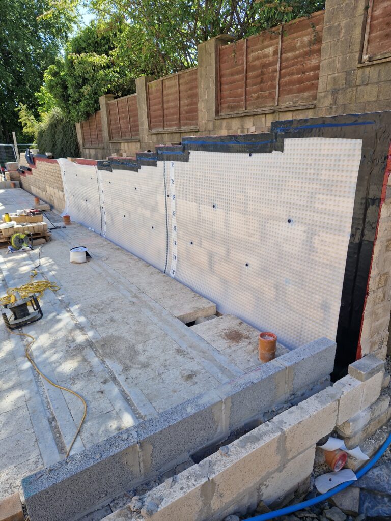 Including a 50mm filet along the foundation toe using repair mortar to help shed water away from the structure and 2 coats of Delta Deuxan 2C Water Proofing Solution on the external face and Delta Geo Quattro fixings at the top of the membrane.