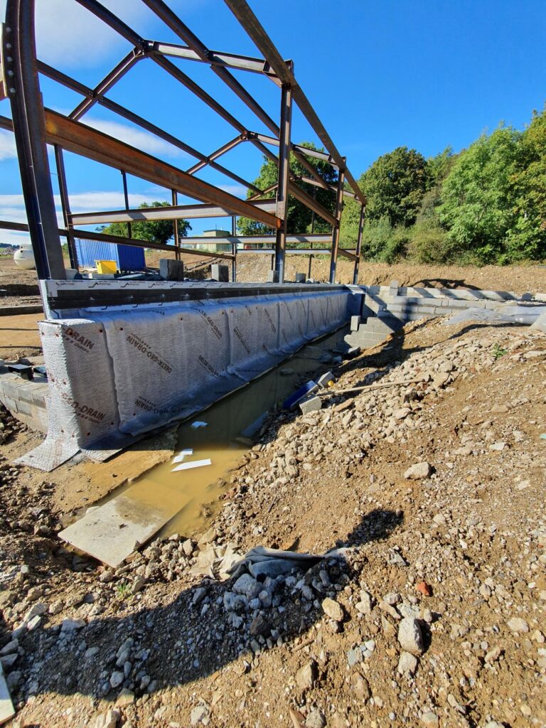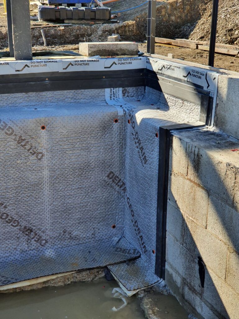 We applied a dual waterproofing system incorporating Type A and Type C systems in order to meet the NHBC requirements for a warranty. The team applied Delta Deuxan 2C Water Proofing Solution to waterproof the external face of the walls. We used Koster NB1, a crystallizing cementitious slurry to waterproof the internal surface of the walls. We added Delta geo-drain membrane to protect the Deuxan. Above ground we installed a MemTech PRO R1 radon gas barrier and this will eventually lie beneath the concrete slab. This is a three layer low density polyethylene membrane reinforced with a polypropylene grid. Finally we placed a Delta vented mat beneath the radon barrier in order to provide ventilation beneath the concrete slab.