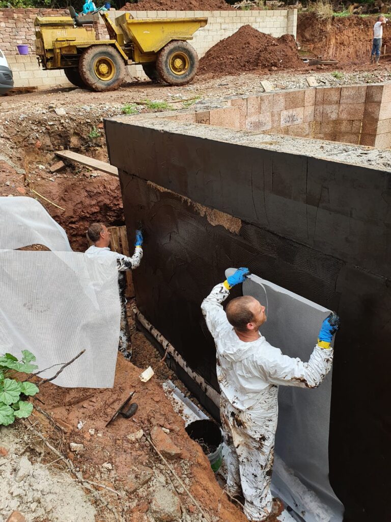 Once the builders had erected the internal and external walls incorporating a land drain away from the property the Damptec team could begin work.
