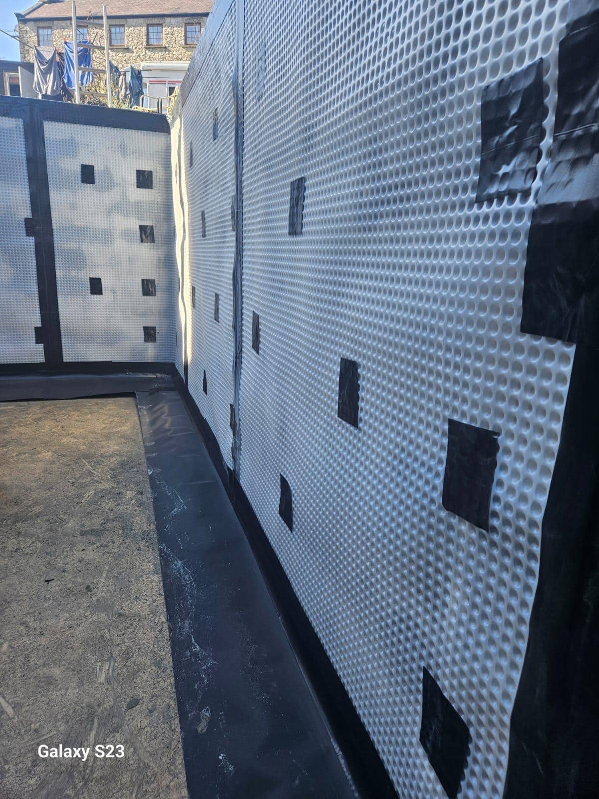 Walls: we fixed Newton 508 (8mm) cavity drain membrane and gas barrier to the internal side of the walls and taped it into the wide DPC.